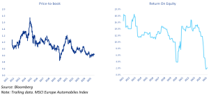 Sentiment is poor, with European autos in aggregate trading at just 0.6 times price-to-book. In the years before Covid, these companies have generated double digit returns on equity, but the market is now implying that they will never earn their cost of capital again.