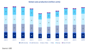 Global auto sales peaked at 94 million units in 2017. Estimates for 2025 stand at around 91 million, with higher financing costs and prices continuing to weigh on affordability. Expectations point to low single-digit annual volume growth in the years ahead, with a return to peak levels by 2028, supported by fleet ages that are already at historically high levels. The industry should also benefit from a moderation in cost inflation and interest rates. The moderate decline in sales over recent years masks a dramatic shift in who is buying the car and who is producing it. Since 2017, car sales in Europe have fallen by around 10%, while the rest of the world is down only 1%. European manufacturers have suffered more than these sales figures suggest, with production in Europe now 24% below 2017 levels. The downturn has taken capacity utilisation in Europe to just 55%, compared to 70% in 2019.