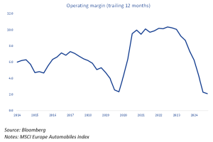 The problems for the European manufacturers extend beyond their home market. China has historically been a highly profitable market for them. Estimates are that before Covid it accounted for 40-50% of net income at Volkswagen, BMW and Mercedes. These profit pools are under enormous pressure, with Volkswagen reporting a drop in joint venture income from China of almost 80% in the first nine months of 2025, compared to 2019 levels. In the past the European manufacturers could point to superior quality and technology, but this perception is being challenged. The headwinds at home and abroad are reflected in operating margins for the European industry overall now at low single digit rates.